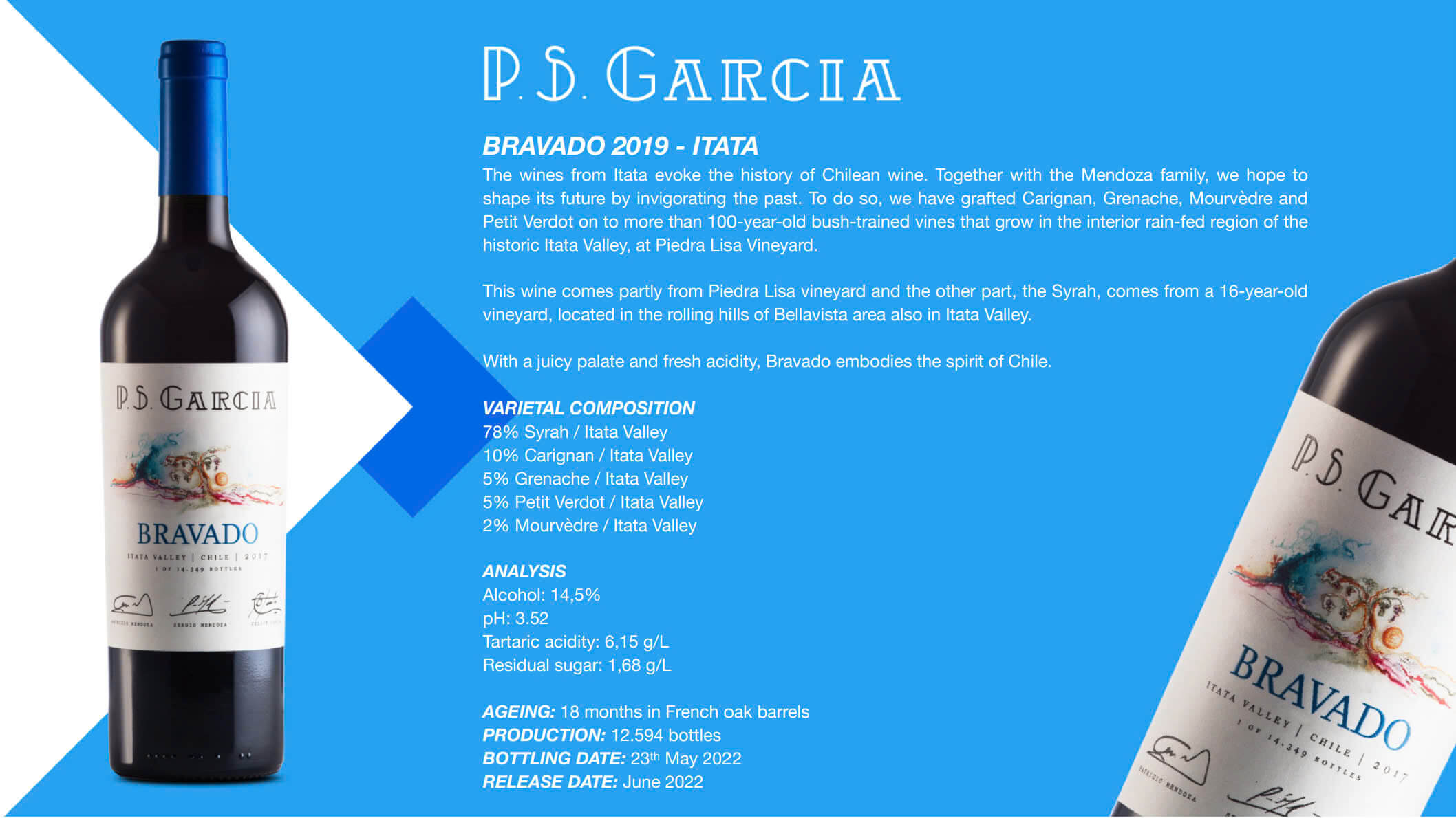 - Rượu Vang Chile P.S. Garcia Bravado Blend mang sắc đỏ tím quyến rũ, hương thơm đậm đà của trái cây đen, cùng vị chua tươi mượt, tạo nên một phong cách tinh tế, thể hiện trọn vẹn tinh thần Chile.